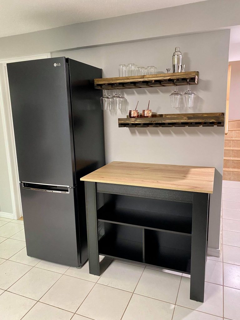 A bar table is located on the side of the kitchen. It is ideal for eating or watching your friends cook.